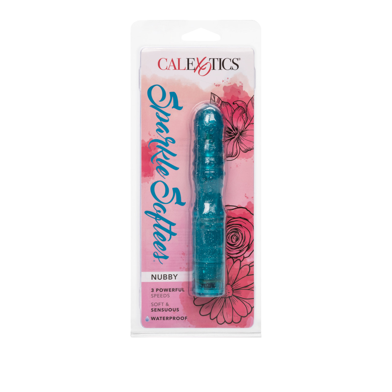 Sparkle Softees Blue Vibrator Nubbie from California Exotic Novelties. The exotic Sparkle Softees stimulator is ultra sensuous, super soft and perfect for intimate arousal and ultimate pleasure. The multi-speed stimulator has a flexible, contoured shaft