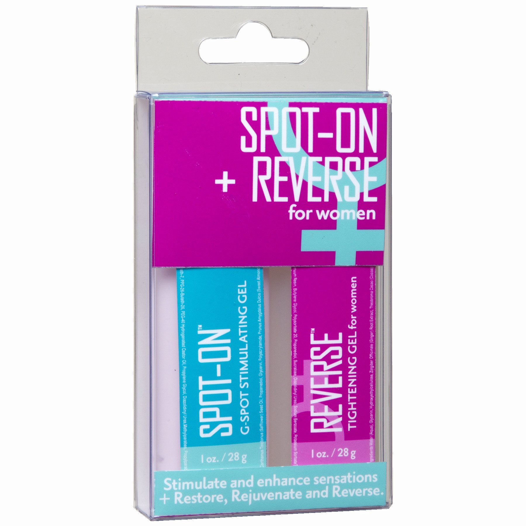 Spot On Plus Reverse for Women 2 Pack. Increase your pleasure with this travel friendly sexual enhancement kit! Spot On and Reverse for Women features a 1 ounce G-spot stimulating gel and 1 ounce tightening gel. The G-spot stimulating gel, Spot On, is a s