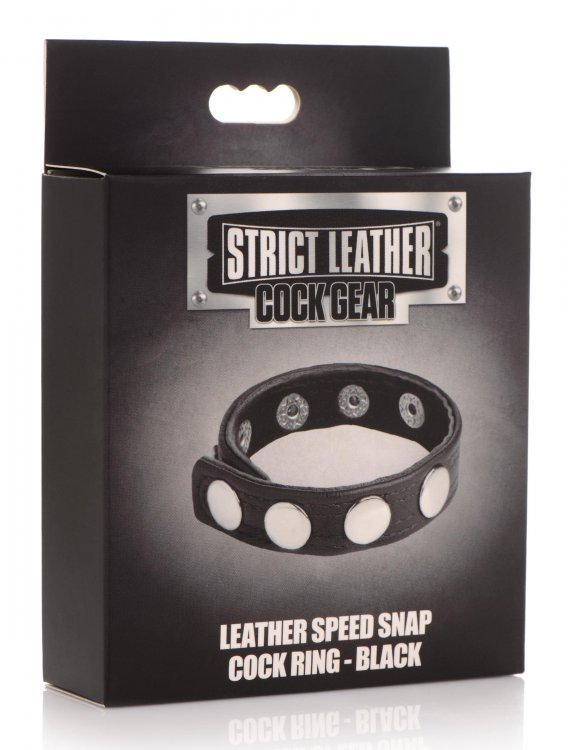 Strict Leather Cock Speed Snap Cock Ring Black from XR Brands. Enjoy the comfort and ease of a leather cock ring that snaps on and snaps off! The real leather is perfect for a custom fit; over time the leather stretches around the shaft and forms to your