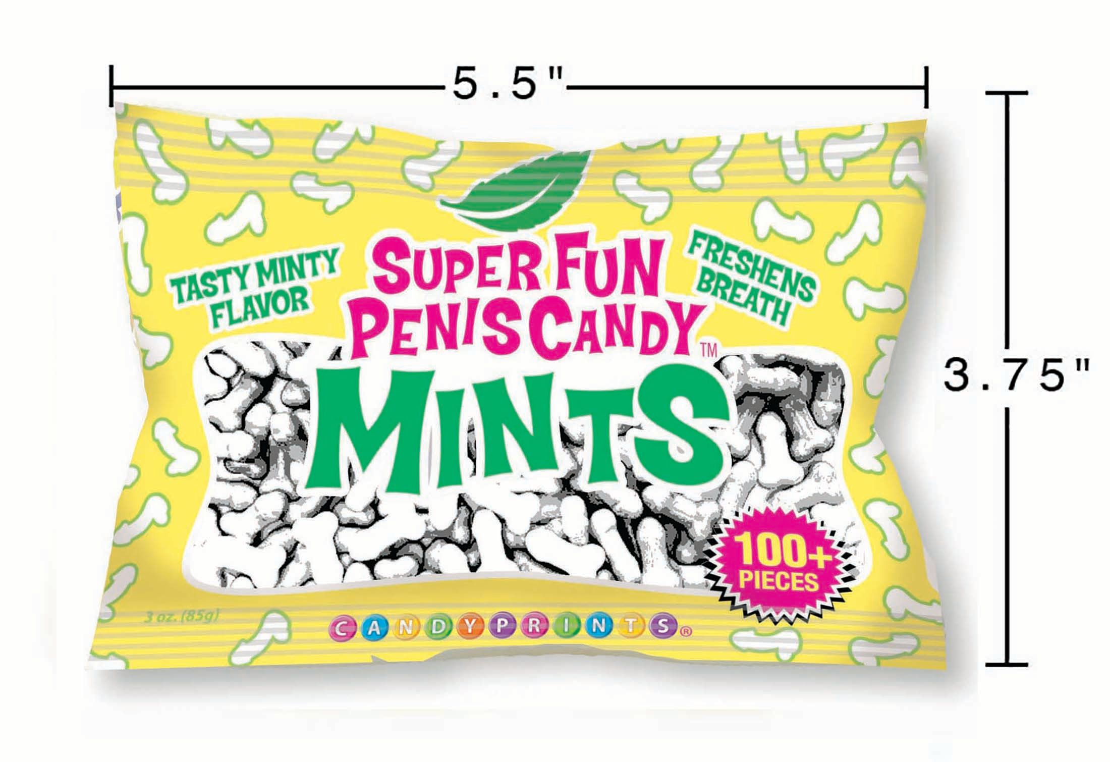 Super Fun Penis Mints 3 ounces bag with plus 100 pieces from Candyprints. Tasty minty flavor. Freshens breath. These refreshing penis shaped mint breath mints are both delicious and hilarious. Make a great first impression by offering up a Super Fun Penis