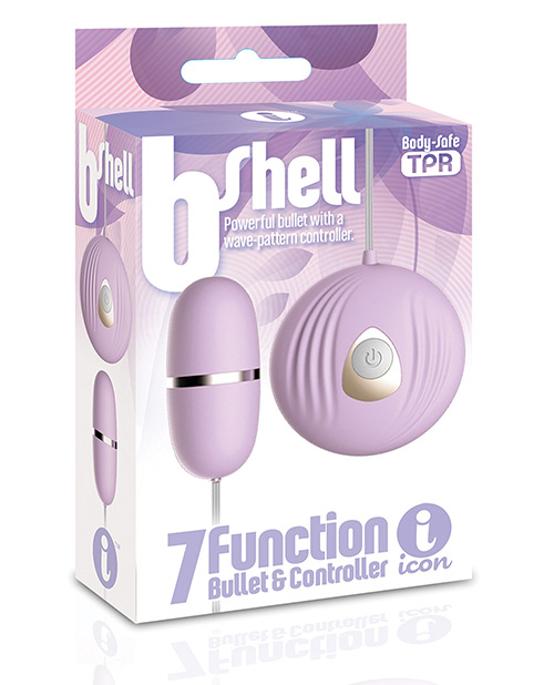 The Nines B-Shell Bullet Vibrator Purple from Icon Brands. Powerful bullet vibrator with a wave pattern controller. Vibrator features 7 functions of stimulation. Made using body safe Thermoplastic Rubber TPR Bullet Vibrator, ABS plastic attached power con