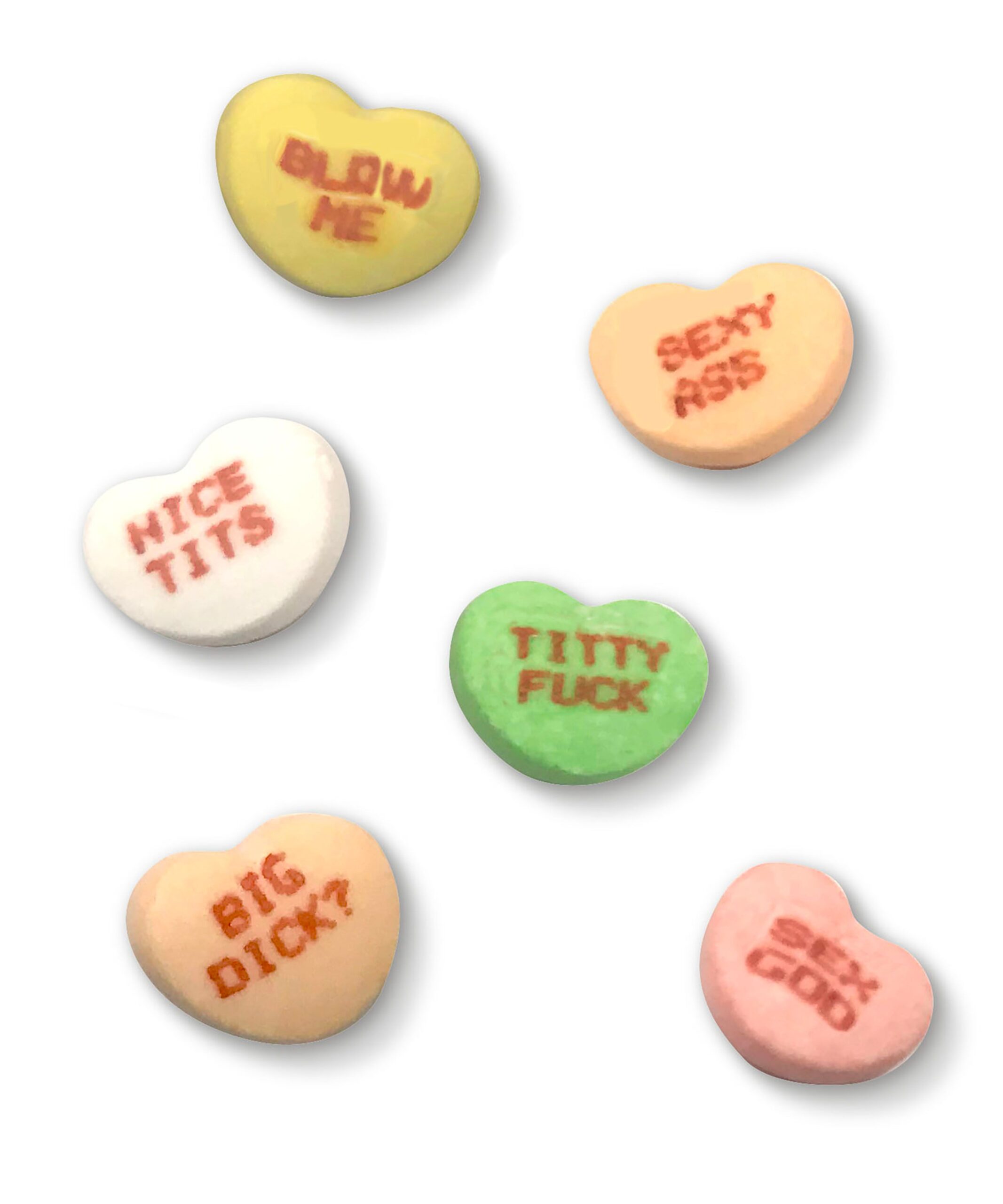X-Rated Valentine’s Day Candy Display 24 Pieces from Candy Prints. X-Rated Valentine Candy 24 Box Display Carton. Each piece of heart shaped candy is printed with a real X-Rated message! Approximately 25 pieces of candy per 1.6 ounces box. This item is so