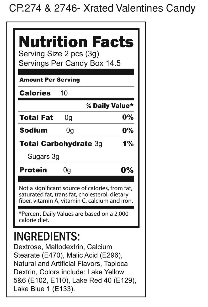 X-Rated Valentine’s Day Candy Display 24 Pieces from Candy Prints. X-Rated Valentine Candy 24 Box Display Carton. Each piece of heart shaped candy is printed with a real X-Rated message! Approximately 25 pieces of candy per 1.6 ounces box. This item is sold only by the display carton. Ingredients: Dextrose Maltodextrin, Calcium Stearate E470, Malic Acid E296, Natural and Artificial Flavors, Tapioca Dextrin, Colors include: Lake Yellow 5 and 6 E102, E110, Lake Red 40 E129, Lake Blue 1 E133. Serving size 2 pieces. Servings per package 14.5. Calories per serving 10. Categories: Party Games, Gifts, Supplies, Adult Candy and Erotic Foods, Valentine’s Day, Sex Toys for Couples. 2023.