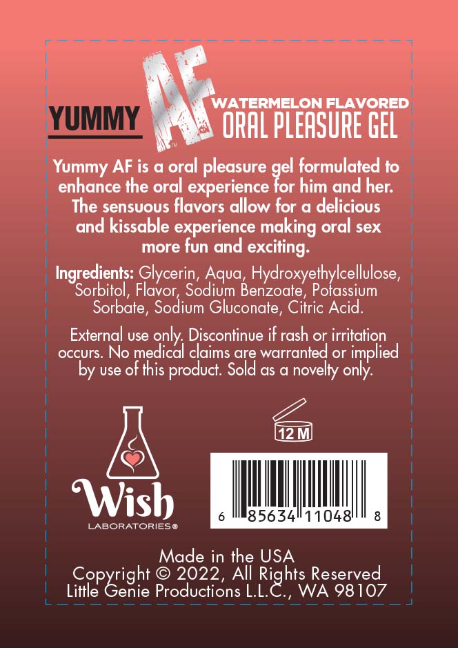 Yummy AF Oral Pleasure Gel Watermelon 2.2 fluid ounces from Little Genie. Juicy AF will make your intimate encounters more luscious. This water based lubricant effortlessly enhances the pleasures of intimacy. Whether you like to play alone or with friends
