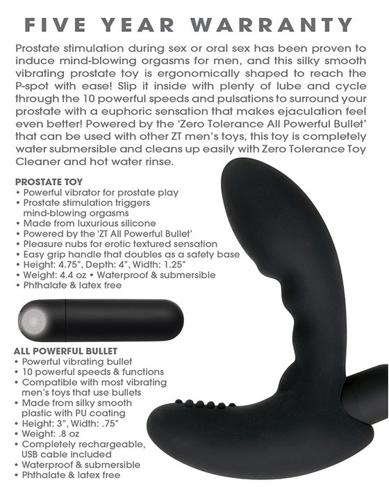 Eternal P-Spot Black Prostate Massage from Zero Tolerance. Prostate stimulation during sex or oral sex has been proven to induce mind blowing orgasms for men, and this silky smooth vibrating prostate toy is ergonomically shaped to reach the P-spot with ease! Slip it inside with plenty of lube and cycle through the 10 powerful speeds and pulsations to surround your Prostate with a euphoric sensation that makes ejaculation feel even better! Powered by the Zero Tolerance All Powerful Bullet that can be used with other Zero Tolerance men’s sex toys, this toy is completely water submersible and cleans up easily with Zero Tolerance Toy Cleaner and hot water rinse. Prostate Massager features: powerful vibrator for Prostate play. Prostate stimulation triggers mind blowing orgasms. Made from luxurious Silicone. Powered by the Zero Tolerance All Powerful Bullet Vibrator. Pleasure nubs for erotic textured sensation. Easy grip handle that doubles as a safety base. Size height 4.75 inches, depth 4 inches, width 1.25 inches. Bulk weight 3.9 ounces. Waterproof, completely submersible. Phthalate free and Latex free. All Powerful Rechargeable Bullet. Powerful Vibrating Bullet. Compatible with most vibrating men’s sex toys that use bullets. Use on its own to enhance sensation on any erogenous zone. 10 powerful speeds and functions. Made from silky smooth ABS Plastic with a Polyurethane PU coating. Completely rechargeable, USB cable included. Waterproof, completely submersible. Features a powerful 10 speed bullet vibrator. Rechargeable via USB. USB cable included. 10 speeds. Waterproof vibrations. Made using Silicone Sleeve, ABS Plastic Bullet Vibrator. Phthalate free. Latex free. Size 4.75 inches by 4 inches by 1.25 inches. Bulk weight 4.4 ounces. 5 years warranty from Zero Tolerance. Categories: Prostate Massagers, P-Spot Stimulators, Prostate Massagers, Vibrators, Rechargeable Vibrators. New Video. 2024.
