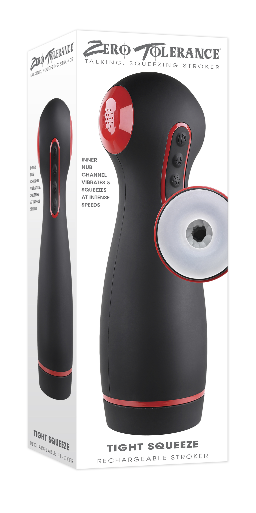 Zero Tolerance Tight Squeeze Male Stroker from Evolved Novelties. Let this deluxe multi-function stroker satisfy your every fantasy! Intense 10 speed vibrations, 7 speeds and patterns of sucking and squeezing and erotic audio all converge to create an exhilarating experience of total satisfaction. Each function operates separately so you can customize your pleasure at the click of a button on the ergonomic canister that fits comfortably in your hand. Fully rechargeable, sleeve removes for cleaning, splashproof. Features: vibrating, squeezing, talking stroker. Vibrating bullet inside Stroker Sleeve. 10 vibrating speeds and functions. 7 suction functions in inner channel. 7 squeezing functions in inner channel. 3 motors controlled separately. Canister made from silky smooth Silicone. Detail made from ABS Plastic. Inner sleeve made from stretchy Thermoplastic Elastomers TPE rubber. 4 button control panel. Light Emitting Diode LED lights up buttons when in use. Erotic audio with female voice. Includes speaker and auxiliary input. Sleeve removes for cleaning. Size height 11 inches, depth 3.16 inches, width 3.46 inches. Weight over 1.5 pounds.